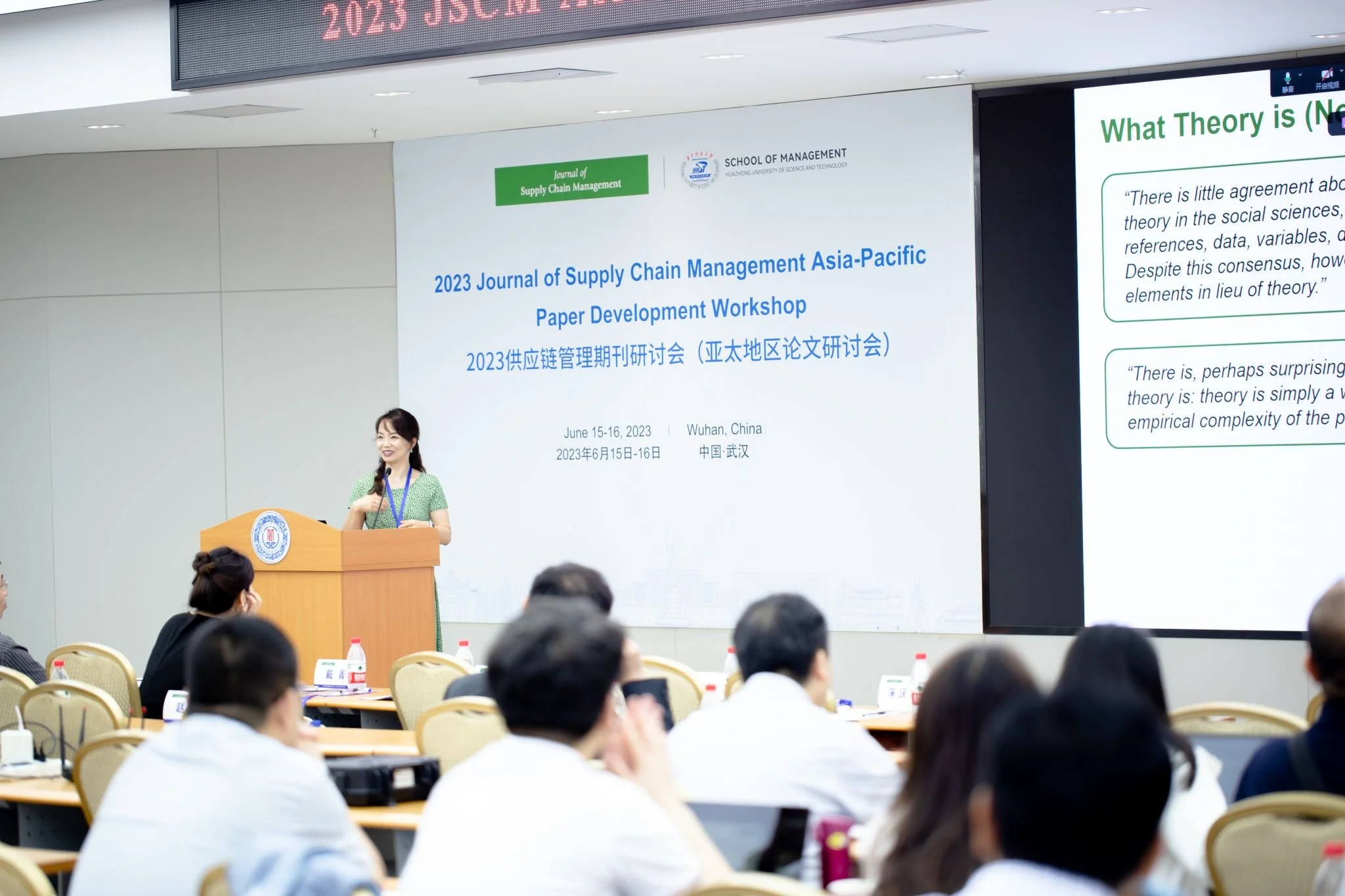 On Friday, June 16, the Journal of Supply Chain Management held a Paper Development Workshop (PDW) for empirical OSCM researchers in the Asia-Pacific region at Huazhong University of Science and Technology (HUST) in Wuhan, China. Over 150 scholars and 15 panelists participated in the PDW, either online or in person. JSCM was represented by its Co-Editor-in-Chief Tingting Yan. In the morning, two hybrid panel discussions were held, one on How to Make Theoretical Contributions, with experts such as Christina Wong, Dayna Simpson, Hefu Liu, Kevin Dooley, Qinghua Zhu, and Sriram Narayanan, and the other on Writing Tips for Publishing in Top Empirical SCM Journals, with experts such as Chunping Deng, Di Fan, Jing Dai, Lujie Chen, Maggie Dong, Vikram Bhakoo, and Zhaohui Wu. In the afternoon, feedback sessions were held where senior experts provided oral feedback to the study authors. All 24 accepted research projects will also receive detailed written feedback from two senior experts after the PDW. The PDW was a great success in terms of providing not only general guidelines but also project-specific written/oral feedback to junior scholars who want to publish in top empirical SCM journals. JSCM would like to thank all panelists, participants, and the HUST administration and conference organizing team for their contribution to this great event.